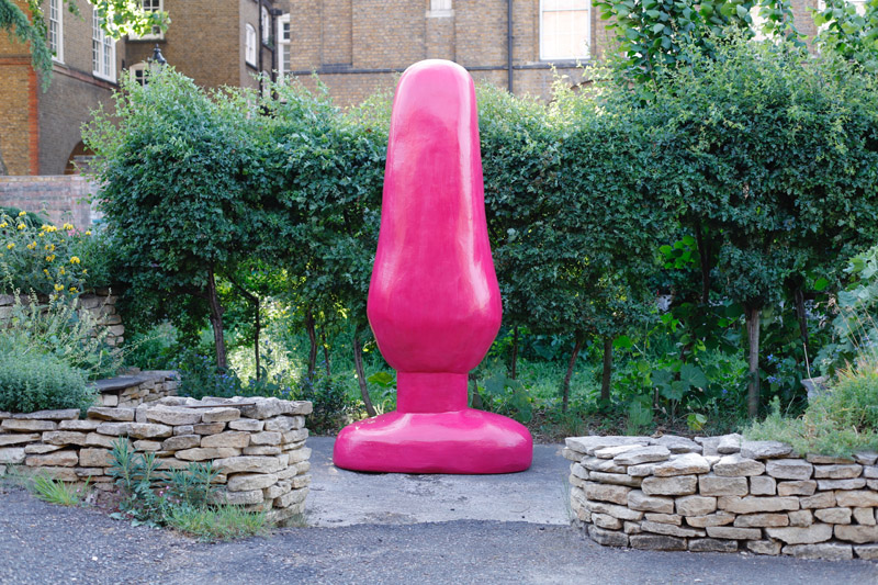 The most predictable sculpture is Kate Howard’s large pink phallus sex toy that stands as a celebration of sexual agency and is part of a series she’s researching into the oppression of women. “The phallus stands as something of a memorial to the work of some of the women laid to rest here and that it was nothing to be ashamed of,” she explains. Made of styrofoam but heavily coated in paint, the work stands at eight feet tall, a playful nod to the presence of The Shard. Its title, above, is as monumental as the sculpture.
