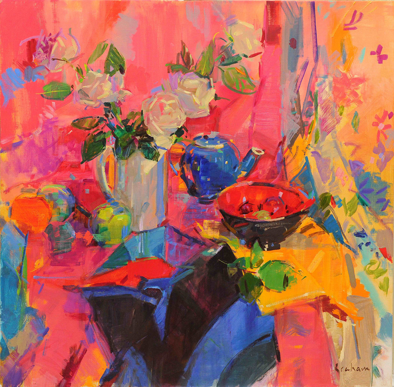 Peter Graham is a graduate from the Glasgow School of Art whose style is purely impressionistic. He’s noted for his bold colours and is less concerned with detail. In Cassis Roses, above, the blaze of red and orange colours unify the painting with the darker colours providing the balancing contrasts. He never uses photography to aid his work, saying that this is how to get to the heart of it.