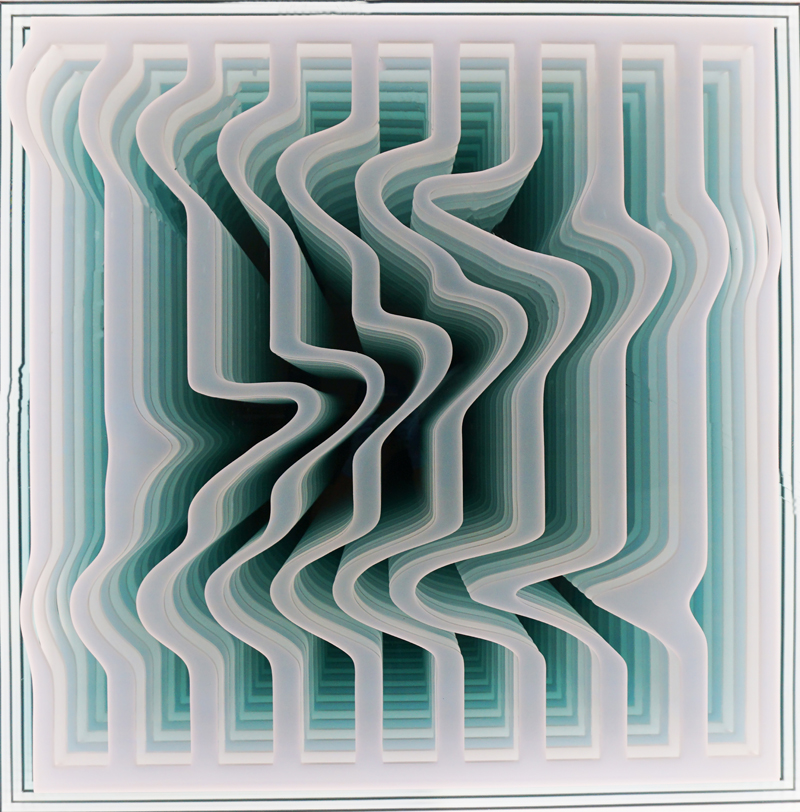 There are more conventional “colour field” works on show in which colours diffuse behind frosted glass, the gradients differed throughout in a most soothing and emotional way. They’re the kind of works you can get lost in. The paintings are backed by a mirrored material that gives the illusion of being backlit and glowing from within. Some works are indeed backlit with an electric light which creates a certain aura within the work, celebrating beauty but also fragility. There’s an installation too in which two planks of wood have been hollowed out at the back and a coloured neon light inserted, the illumination from which reflects on to the gallery wall.