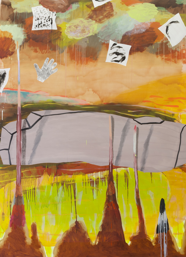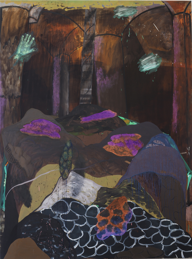 Beneath[Before]/ FeS₂, above, is typical of this new work with its mix of the figurative and the fantastical. It’s one of several large works, two metres high. Structures support a mine in which coal is represented at the bottom and the lusciously contrasting purples, browns and greens on the rocks catch the eye. Then there is a hand floating near the surface, which she tells me, is scaled to her own hand, and which relates to the idea of connection.