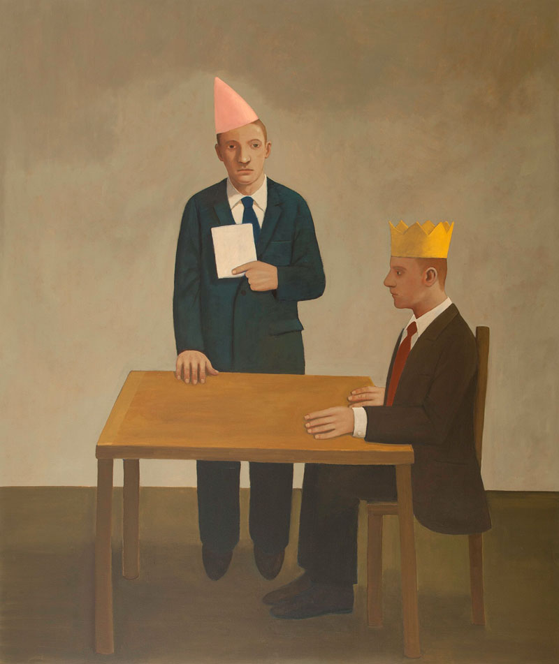In the ironically titled, House of Fun, above, the two characters appear almost wax-like at a table with a skewed perspective. It reflects a skewed view of life which Kirby describes with a smile as “a bit of a pain in the arse”. There’s something slightly disconcerting about the piece of paper the standing man is holding in his hand as if the other figure has got to be seated in order that he can bear its bad news.