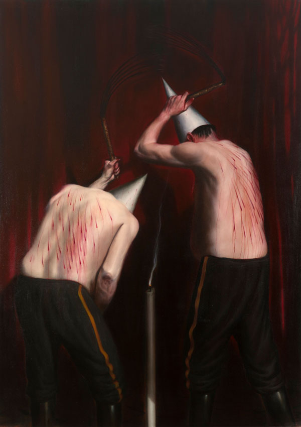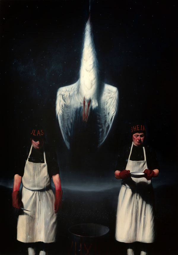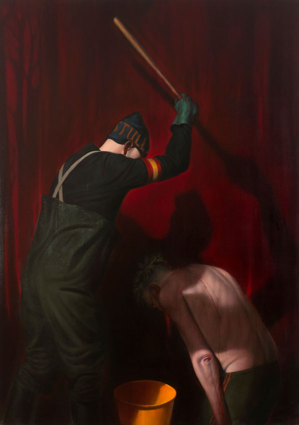 Violence was something that was commonplace in my life growing up. I lived in the outskirts of Glasgow but I lived with violence every day. It was something I had to come to terms with. Violence towards animals, violence towards other people, violence for no reason at all, it was always there. It’s part of the working class experience. Men had to be men. You didn’t sit around discussing Nietzsche, you weren’t going to win intellectual arguments so people used to fight. So violence for me is not an alien thing. I’ve experienced violence and I have to put my hand up and say that I’ve meted it out as well as part of my growing up. You had to have that physical edge to get through life in those days but things are much more civilised now. I went to art school and decided to get it out of my system I would paint about it and I still am. Also, art history is full of violence. I’m massively influenced by the painters of the past. My work is in a state of permanent homage to the masters like Bosch, Caravaggio, Rembrandt, Velasquez, Goya. You have to talk about Goya when you talk about these paintings. He’s a massive influence on me. He was no stranger to the depiction of violence. He wanted to show a picture of who we truly were, the good and the bad. So it’s not something I want to shirk away from. Also, looking at violent imagery makes you think about things in a deeper way. Why did this artist paint this, why did the artist confront these things? Hopefully, out of this thought process, people will come to their own conclusions about what we are. Have we really got rid of these primitive urges? I don’t think we have.