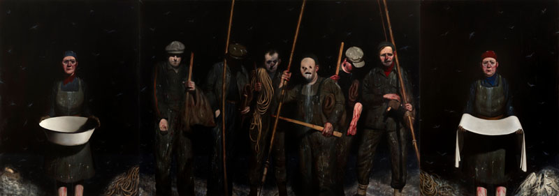 I think what I’ve got to do with this painting is to create a starting point for people to understand where it’s coming from. It’s not necessarily a painting about the guga hunters. It’s about slightly deeper things. It’s about living life on the edge, the horror of violence, survival and the cycle of birth and death. If you look at the two flanking panels, there are two female figures there with an egg in a nest by one in the corner and in the other corner is a bird that has expired. The bowl is like a bath you would bathe a child in and the other is like a winding sheet, a shroud. So you have birth and death and between them that these people have got to survive. So it’s really about the extremities that people have to put up with and survive. And there are lots of ambiguities in it. There’s lots of blood, they’re covered in bird shit and you don’t know if these people are sinister like a gang of murderers or something or is it something these people have to do to make a living.