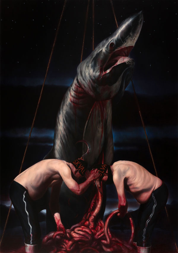 Pessimistic, misanthropic, all of those things. It’s a good, default position to cope with the world today (laughs). The painting about the basking shark, for example, if you look behind the loop you see this dark shape in the water which might look like a shark but in actual fact represents a trident submarine which patrols these same waters. I’ve seen them many times. So there’s a kind of violence that these guys are engaging in which is to slaughter these beautiful basking sharks but there’s another kind of violence, the violence of war between nations. I live 45 minutes away from the base. It’s beside a major population centre and every Glaswegian will tell you it’s something on their mind. That’s mass destruction and that’s never going to go away. Life may be improving on a day-to-day basis but we still have the capacity to wipe ourselves out with a flick of a switch.