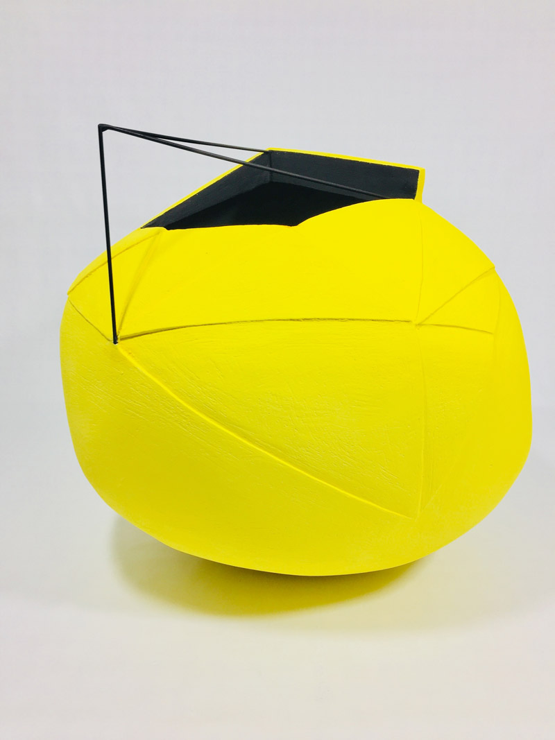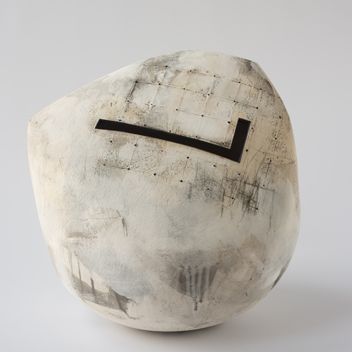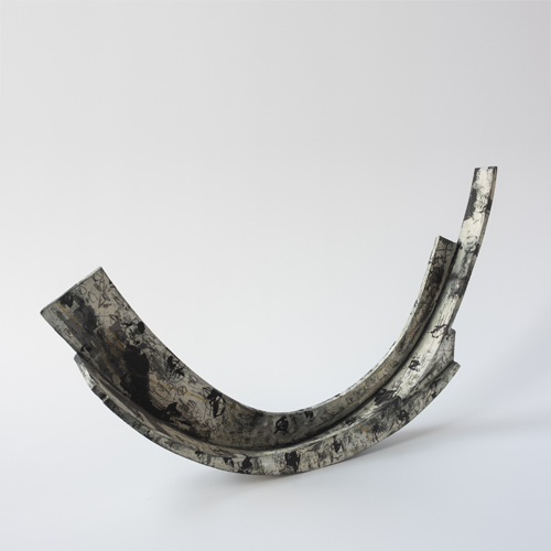 Curved Frangere II was inspired by the discovery of a rusting old car part – a wheel arch in fact – that she found abandoned by a road. She was attracted by its sweeping curves and sculptural form. She built on the idea, literally, with slabs of the white earthstone Ashraf Hanna clay, strong and very forgiving with minimal warpage and shrinkage. A whole series was born from that chance discovery.