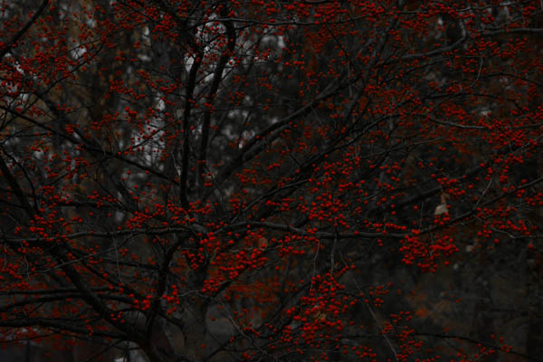 This hawthorn tree was taken in New York’s Central Park. The predominant red is set against the dark background, shot at dusk. Another in the series shows a feather nestling in bushes in London’s Kew Gardens and there’s a landscape of a house being constructed on a hillside in south-west China.