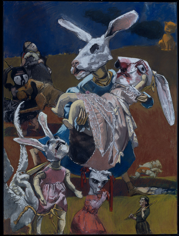 Nevertheless, Paula Rego had found the style that we now most associate with her. She continued to address moral challenges to humanity in her distinctive way. War was inspired by a newspaper photograph of the aftermath of a bomb blast in Iraq. Rego has given the people rabbit heads that gives the work a surreal and bizarre flavour, emphasising the brutality somehow. All sorts of violence takes place at the sides of the picture, then, strangely, Rego’s old dance teacher appears out of scale at the bottom right. It’s perverse, then so is war.
