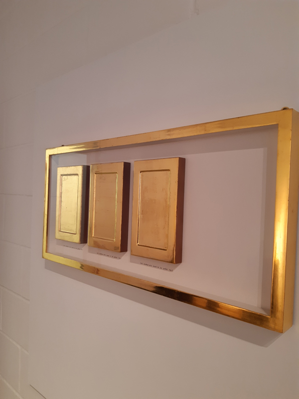 Wassall’s love of process and experimentation are exemplified in And Somehow we’re meant to be Perfect, pictured above. Like all her works, it’s multi-layered. It comprises three traditional icon boards with 24ct gold mirrors placed inside a golden frame. The mirrors, from left to right, represent Wassall’s progression in learning water gilding, a highly skilled art using rabbit-skin glue and gesso.