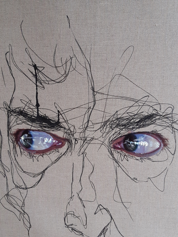 Shamma has also included in her show a series of simple line drawings on canvas that contrast with detailed, startling pairs of eyes. These are inspired partly by the leers of men directed at women in the streets of many countries in the middle-east. It’s the kind of voyeurism directed towards trafficked women too. The one above is typically lustful and threatening, the eyes almost glutinous with the light skilfully drawn.