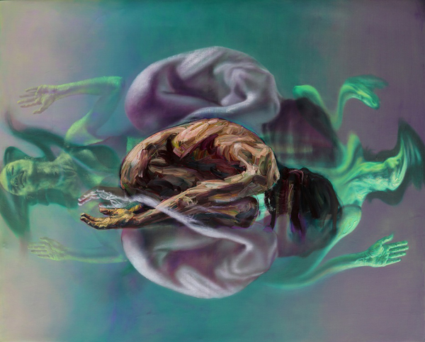 In and Out, above, is many-layered both conceptually and physically. The first layer sees the green, semi-translucent figures flailing around in mental torment. Shamma has created an effect of a soul in meltdown, swimming in a sea of despair. You can feel the damage in the shape of the central figure’s body. It could be seen as grief-stricken or perhaps it’s a yoga position redolent of healing. The raw nature of the pink reflections at the top and bottom indicates Shamma’s continued fascination with anatomy, a subject she studied in Syria before turning to art.