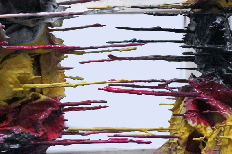 His sculptures for this show revolve around the use of fabric inflatables which he wraps round an armature and then pours on resin. Once the resin starts to cure, it turns rubbery which gives him time to sculpt it in whichever way he wants before it hardens. He then applies enamel paint and lashes of lacquer.