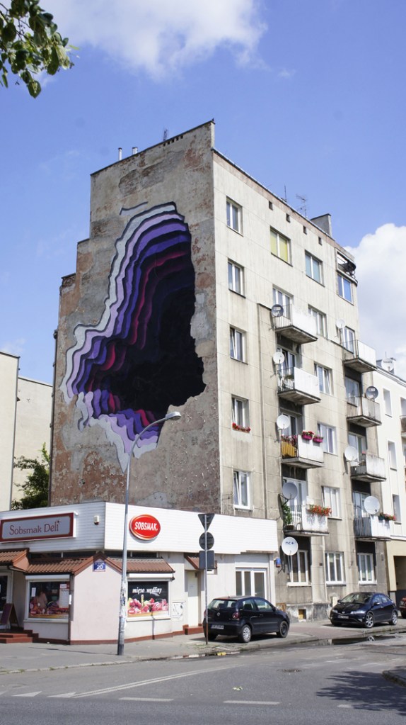 1010 (pronounced tenten) is a Polish street artist now living in Hamburg who specialises in graphic illusion. He was the first artist Danysz signed up. His murals, with their signature colourful rings, are to be seen in many European countries. The picture on the left above is from a block of flats in Warsaw, the one on the right being here at Lazinc.