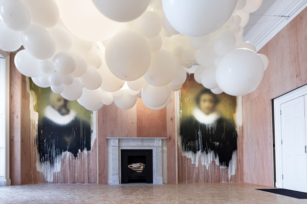 After climbing the wonderfully elegant Georgian staircase to the upstairs room of the gallery, we are greeted by a balloon installation by Charles Petillon. Some might remember four years ago how this artist covered the arched ceiling of Covent Garden with 100,000 pristine white balloons, giving the space a dreamlike effect. At night, flashing lights produce a heartbeat effect.