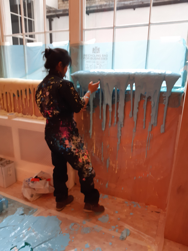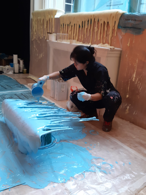 In the adjoining room, American artist Dan Lam, of Vietnamese heritage, was in the process of pouring paint mixed with resin on to one of her polyurethane foam sculptures which you then see her hanging from the window sill. The rewarding thing about watching artists at work is that you can engage with them and ask them about their process.
