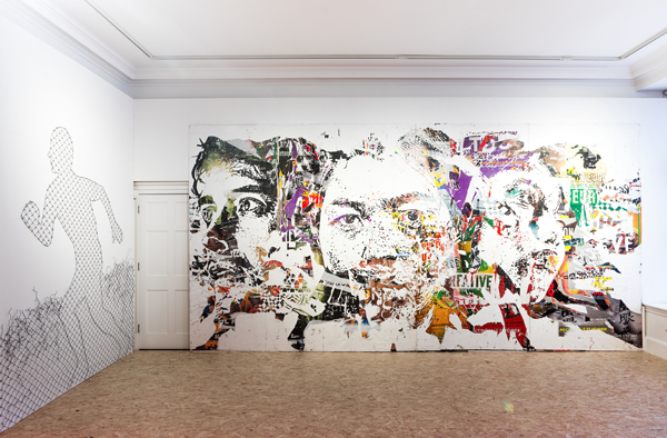 In the gallery’s first room, to the left is a man crossing a fence made from wire by two Iranian artists named IVY and SOT which alludes to the migrant crisis affecting so many parts of the world. The central wall features portraits by a Portuguese street artist who goes by the name of Vhils. The portraits comprise remnants of used posters and flyers glued to layers of billboard. Originally a graffiti artist, Vhils’s portraits can be found on many buildings in his native Portugal and beyond for which he scratches the surface of walls with a hammer drill, even explosives.