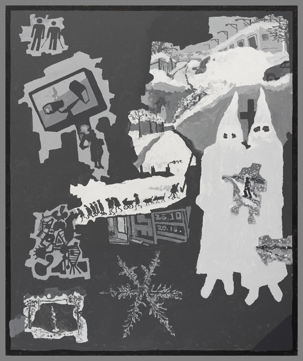 The third element of the show came about when he decided he wanted to work in black and white. The resultant Night and Snow comprises a number of paintings on such subjects as fashion, religion, rock music, video games, even football. He remains a Portsmouth fan, his city of birth. You can detect in the picture above elements of LS Lowry, French Impressionism as well as snowy scenes taken from his own photographs. The ubiquitous Ku Klux Klan also make an appearance. As the image at the very top, Snow (Night and Snow) shows, he soon incorporated colour works into the series. This may make them more commercially viable to collectors but Boshier argues that that doesn’t influence him.