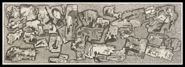 The current turbulent times in America where Boshier has lived since the 1980s, first in Texas and currently in California, is meat and drink for the artist. America America (above) began as a small pencil drawing. However, it was then digitised for better contrast, scaled up and sent to Belgium to be converted into a 10 x 15 foot jacquard tapestry. It was first displayed in California and later in Wales.