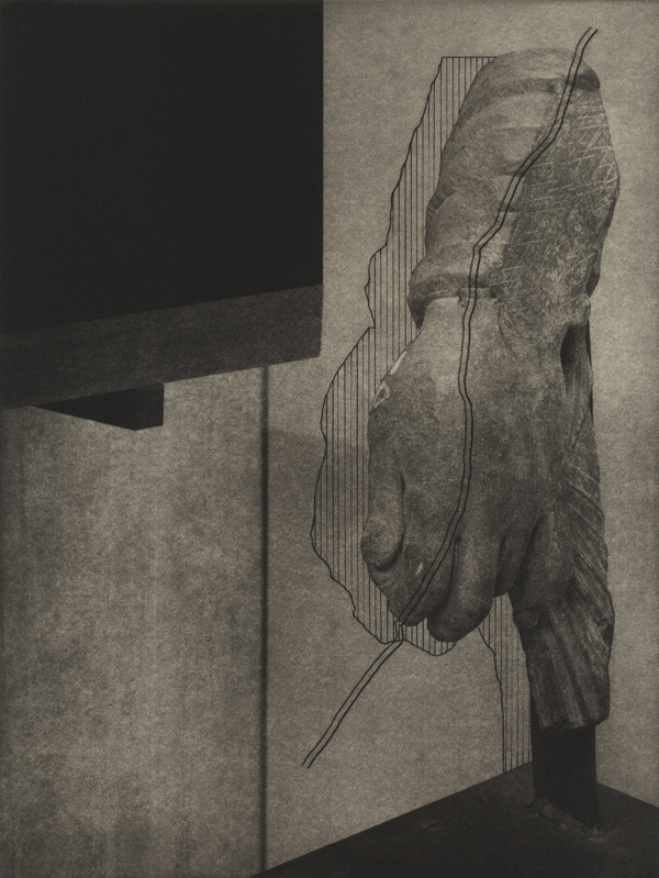 The series consists of complex photogravures of sculptures that retain an architectural aesthetic but mix drawing, printmaking and photography. She deconstructs and transforms the space, focusing on empty spaces that symbolise what she calls “the erasures, ruptures and underlying violence in relationships between objects, history and architecture”.