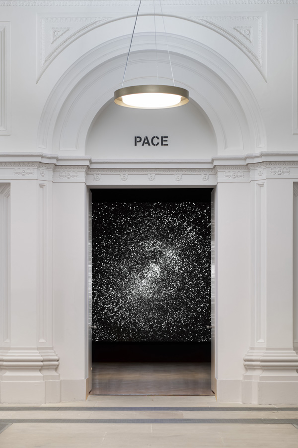 A silver sun sends out waves in pulses that suddenly dissolve into a swirling mass of tadpole-like shapes. A molten core waxes and wanes while shooting stars erupt around it in seemingly endless and varied sequences. These white light installations, one nearly 40 foot wide, some as individual pieces, others as triptychs, are by American artist Leo Villareal in his first solo exhibition at London’s Pace Gallery.