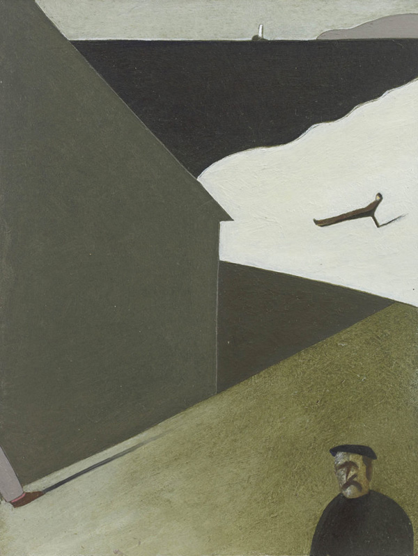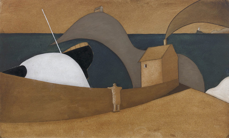 The top shot is typical of his paintings. They are highly stylised in their simplicity, are tonal and built up from straight and curved lines. His figures are small because, he says, he never learnt to draw. “If I have to work on a figure that’s more than four inches high, I have to work on it for a week”, he laughs. He looks on himself as an illustrator, for each work tells a story. The above shows the St Ives painter Alfred Wallis looking at the wreck of the Alba, a boat that came to grief close to his house with the cost of several lives.