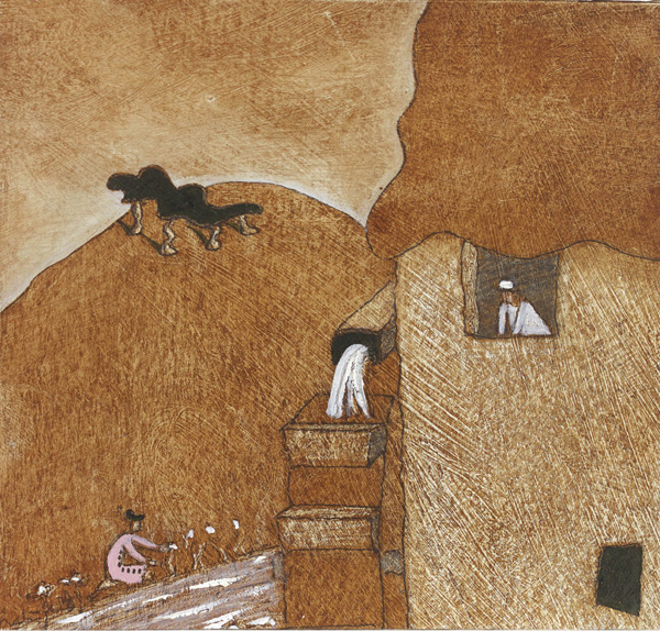 The pictures above are illustrations from a series of poems called Lily and Miller. The miller is reprimanding Lily from the window for picking flowers too close to the river, worried that she’ll fall in and that he’d have to rescue her. The next one shows him taking off her wet clothes as the mill turns through the window.