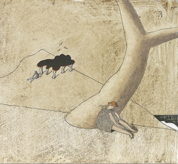 A gentle humour recurs in Lanyon’s oeuvre. If the miner on the left, above, breaks through to the surface, the golfer’s going to end up in a bunker rather bigger than she might have imagined. As Andrew Lanyon so elegantly writes in the catalogue to the show, “the hope is to preserve some of the humour generated by writing, while soaring above the chatter of text, when the pointed nib has been dropped for the broader brush”.