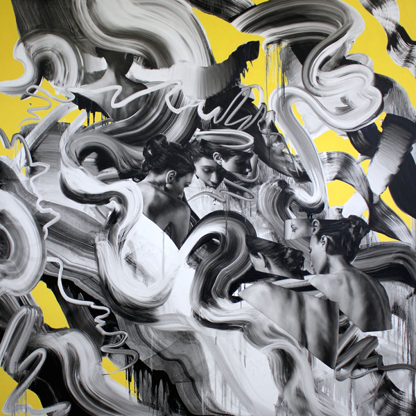 The small figures are almost photo-realist in their execution and their classic poses and dreamlike expressions blend into the swirling abstract elements. French leaves plenty of open space in order to balance the intensity of the image. In French’s own words, “there is no single reality here, the realities transcend and co-exist, they repeat and overlap and, particularly with the illusion works, transcend the usual boundaries”. The distorted, ragged nature of the outer face leaves plenty of room too for individual interpretation.