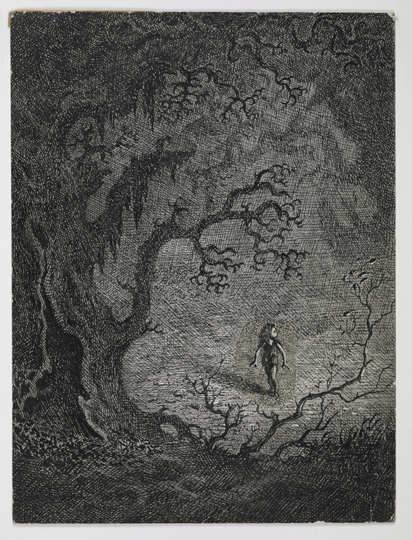 This example above, from that same Brothers Grimm collection, encapsulates his ability to create for children a sense of delight, wonderment as well as fear. Here the tiny child is alone in the dark in a wood in which the claw-like branches of the trees seem to be clutching at her.