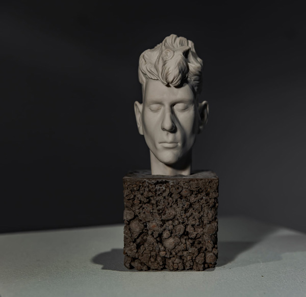 The contrast between the hard exterior and fragile interior he expresses through his choice of materials. The busts are made from porcelain and mounted on a type of concrete made from a by-product of iron ore extraction. “I wanted them to be classical in format and texture,” he tells me, “and then mount them on something average that we can all identify with, and concrete is something we can all associate with now.”