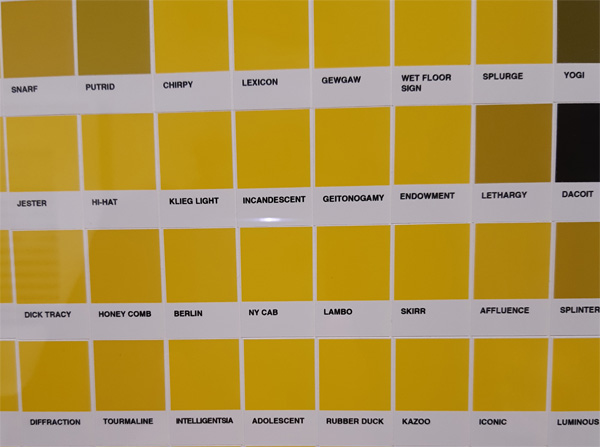 However, come up close to the works and you see that he has replaced the original names on the swatches (or colour chips as he calls them officially) with random words triggered by the shade of colour and which give the works a whole new side. It’s what Smith has termed psycolourgy, a kind of portal into his way of thinking and state of mind at the time he named them.
