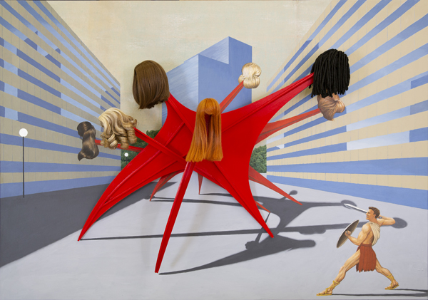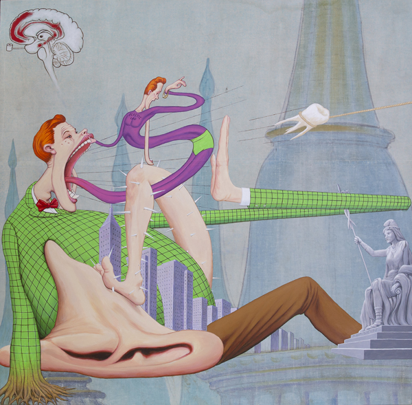 In the painting above, Jimmie confronts the Goddess of Reason that failing French Revolutionaries created as their figurehead for a new atheistic religion to replace Catholicism. His gigantic tooth has been extracted and his brain has escaped his body, somehow morphing into the cartoon hero Popeye. Jimmie Olsen is a recurrent figure in the show, appearing as a giant turtle monster attacking San Francisco’s Golden Gate Bridge and in another work in which he is possessed by the helmet of hate.