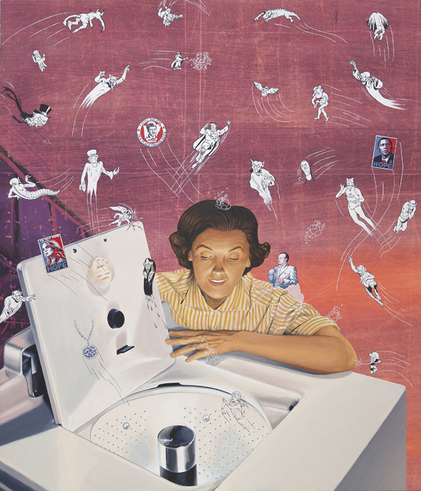 There are more subtle satirical references too. The ‘50s housewife, another habitual Shaw motif, gazes adoringly at her automatic washing machine, a totem of the American Dream and, in this instance, a Pandora’s Box. Opening it releases all manner of demons as well as emblems of hope. There’s Hope Hicks, for example, one of Trump’s PR team, appropriate perhaps as part of his ‘spin cycle’. Bob Hope is there along with Barack Obama’s ‘Hope’ poster for his 2008 Presidential campaign. Hope against Hope. The Ancient Greeks saw hope as an evil that encouraged deluded humans to suffer in the hope that things would improve.
