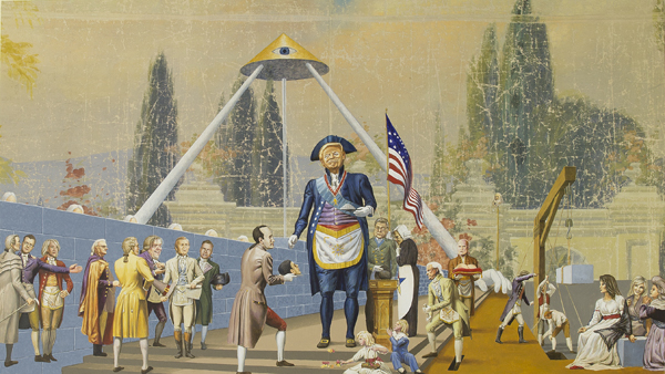 In fact, Trump looms large in this show, literally. His supercilious, self-satisfied smile greets you as you enter the gallery in a big painting in which he is depicted as the Master Mason with the all-seeing Masonic eye positioned above him. The painting is based on a mural from The George Washington Masonic National Memorial Hall.