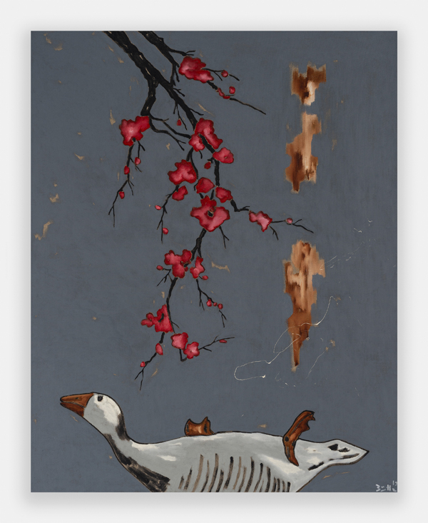 Cherry red dominates this beautiful but funny work, above, with a delicious contrast between it and the grey. About it, Büttner says, “Most earthlings adore the sight of cherry blossoms. I wondered if I could picture their beauty. But cherries blossom approximately ten days. The rest of the year the world is not kitsch, but ugly and cruel. The ancient greek philosopher Theophrast told us: Beauty is dumb deceit . So I had to put a fallen goose under the blossoms as a reminder of that lousy fact.” Well you would, wouldn’t you.
