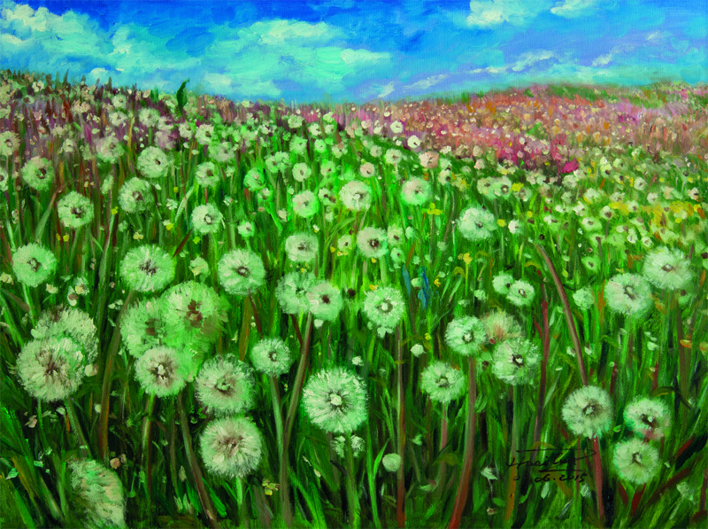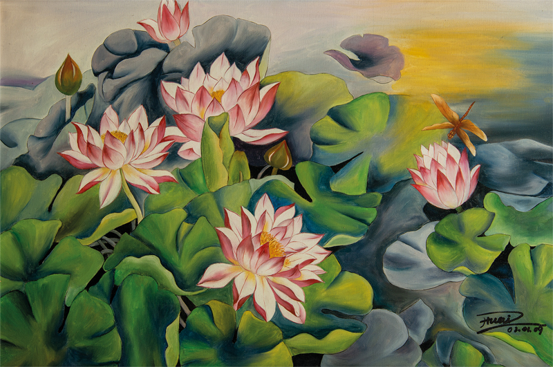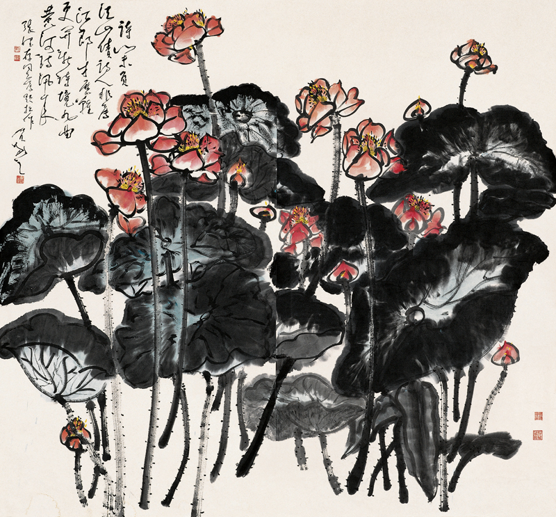 Zhang quotes the ancient Chinese philosopher Zhou Dun Yi in his poem Loving the Lotus. “The lotus grows in mud, yet never contaminates with it. And she floats on waving water, yet never dances with it”. She has depicted many versions of the flower bringing to it a very personal style. You see it in full bloom, as buds in water often accompanied by modern poetry in Chinese text. She imbues within these works a melancholic, nostalgic air.