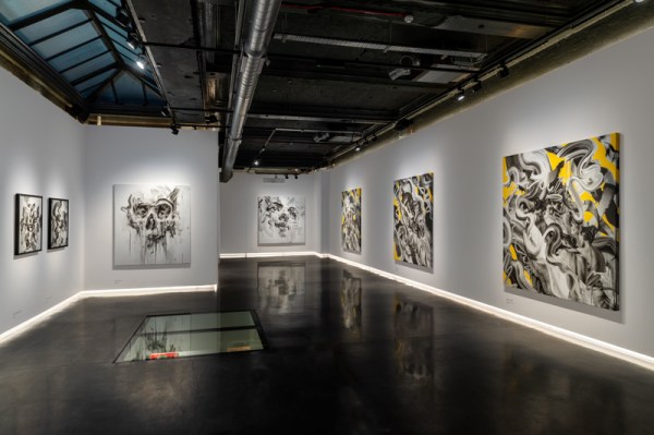 The stark and arresting picture of the skull towards the left of the top picture is entitled Vessel. It forms the centrepiece of this new exhibition and faces you as you enter the Unit London gallery. It’s typical of what Tom French has earned a reputation for – monochrome works featuring an illusory quality. Recent circumstances have given such works an extra poignancy.