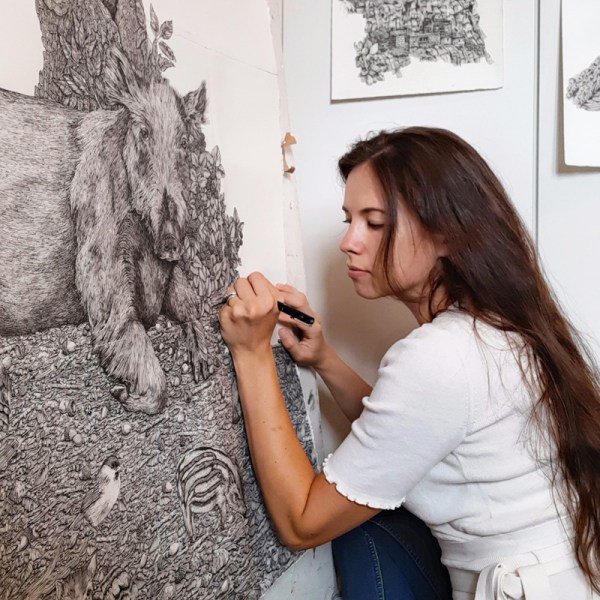 In our latest podcast episode, Olivia Kemp talks about her large-scale pen and ink drawings of magical landscapes and interiors full of personal and art historical details. She tells how art has inspired her since childhood, why she prefers pen and ink to paint, her love of the playful in her work and how a residency at the Prado Museum in Madrid five years ago spawned her current solo exhibition in London.