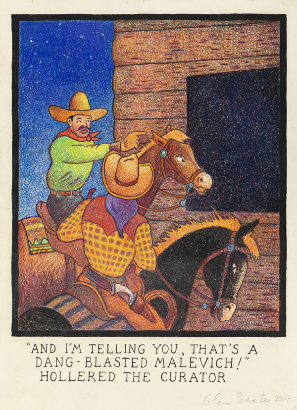 “I’m a total believer in absolute nonsense. The absurdity of life is my single goal.” So says artist Glen Baxter whose latest exhibition has just opened at London’s Flowers Gallery in Cork Street. Its very title is appropriately absurd. Gamboge is a yellow pigment that Buddhist monks use to dye their robes. Put it next to the wonderful word “unflinchingly” and you get what he calls “a little explosion”.